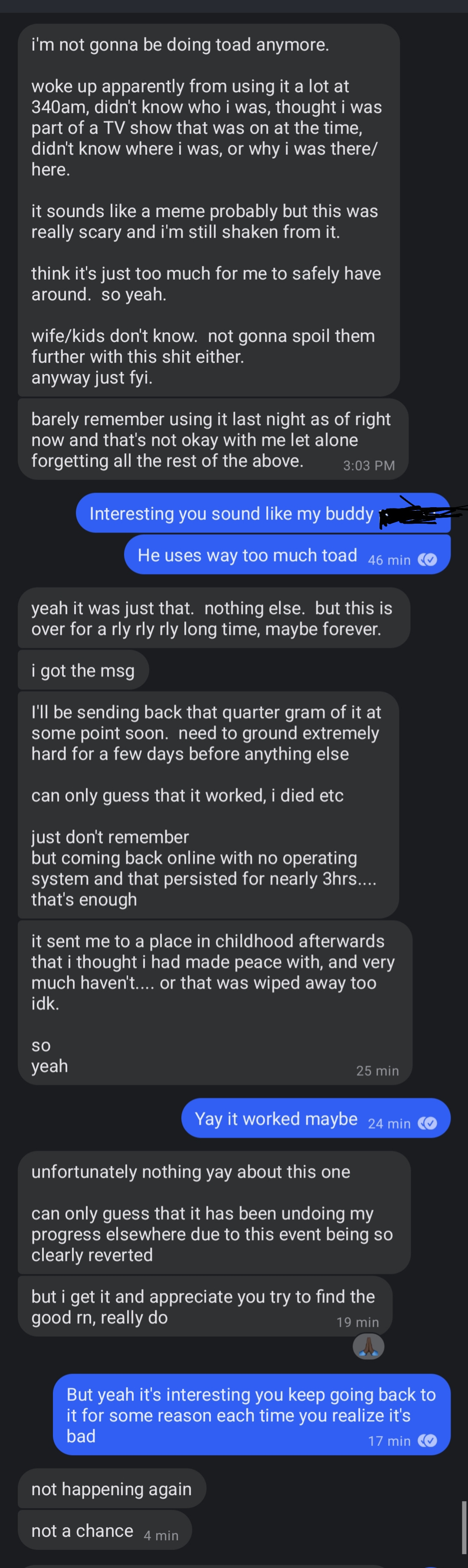 In addition to causing my friend S (and friend P) here’s liver/gallbladder congestion, gut and heart problems, bufo also caused him and my friend P to have something like prolonged unconscious dangerous behavior. S said: “Also, i feel like i’ve been a really shit parent the past few months by being so entangled in the 5meo mess... it has been really disruptive. even with just not sleeping enough but also just the memory not being great etc.... i don’t like it, i don’t like the toll it took. has been a bit sobering.”