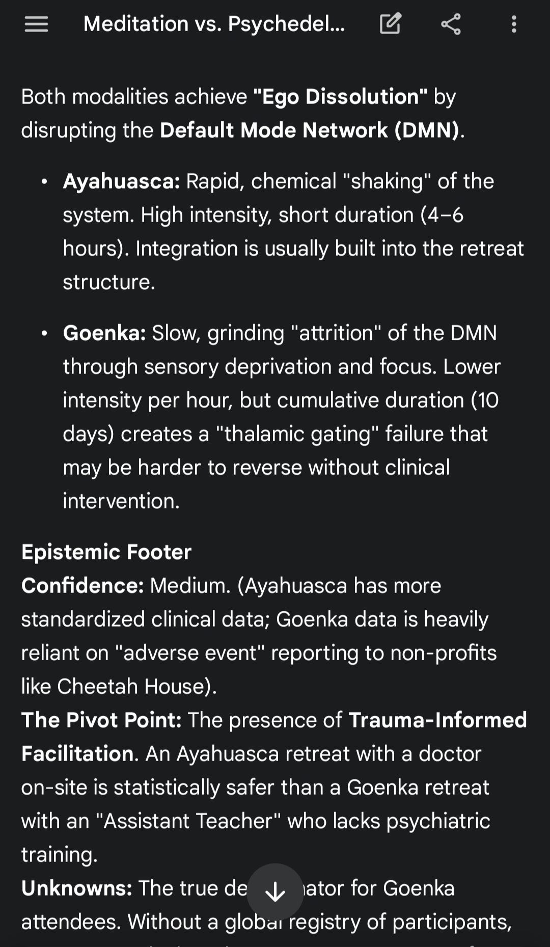 And in fact, anyone with a recent history of mental instability is not allowed into a Goenka (nor most Theravadan Buddhist) retreat, since the risk of destabilization is known to be high (3x greater long-term dysfunction likelihood compared to an Ayahuasca retreat).