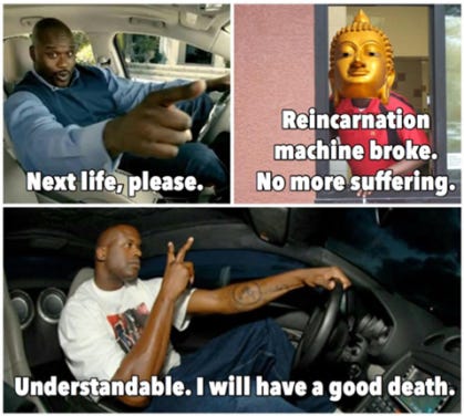 If we just live and die and that's it (no rebirth) then we can solve all problems with a bullet to the head (or parties?). But, there is a huge mountain of evidence that this is not the case (perplexity). Whatever suffering you experience now is only an infinitesimal amount compared to what "you" have experienced before in other lives and what "you" will experience in future lives until "you" realize that you don't exist.